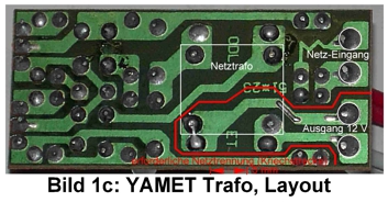 Im Beispiel der 2. Bildreihe unten wird ebenfalls ein Trenntrafo eingesetzt, aber im Layout (Bild 2d) ist wieder keinerlei Kriechweg zur sicheren Trennung zu sehen (rote Linie markiert die Trennstellen). Als Schaltregler wird ein MT7953 (Gehäuse SO8) eingesetzt, zu dem es viele Applikationsbeispiele gibt. Das IC liegt auf der Netzseite. Die beiden Kontakte rechts unten im Layout gehören zur Sekundärseite des Trafos. Ein Anschluss davon geht an Ausgang V- (unten rechts), der andere wird über eine Gleichrichterdiode (auf der anderen Platinenseite) und einem Glättungskondensator (im Layout der gelbe Chip rechts außen) auf Ausgang V+ (oben rechts) geführt. Bei diesem LED-Trafo ist kein Zeichen für "Sicherheitstrafo" aufgedruckt. Auch hier besteht ein Unfallrisiko.