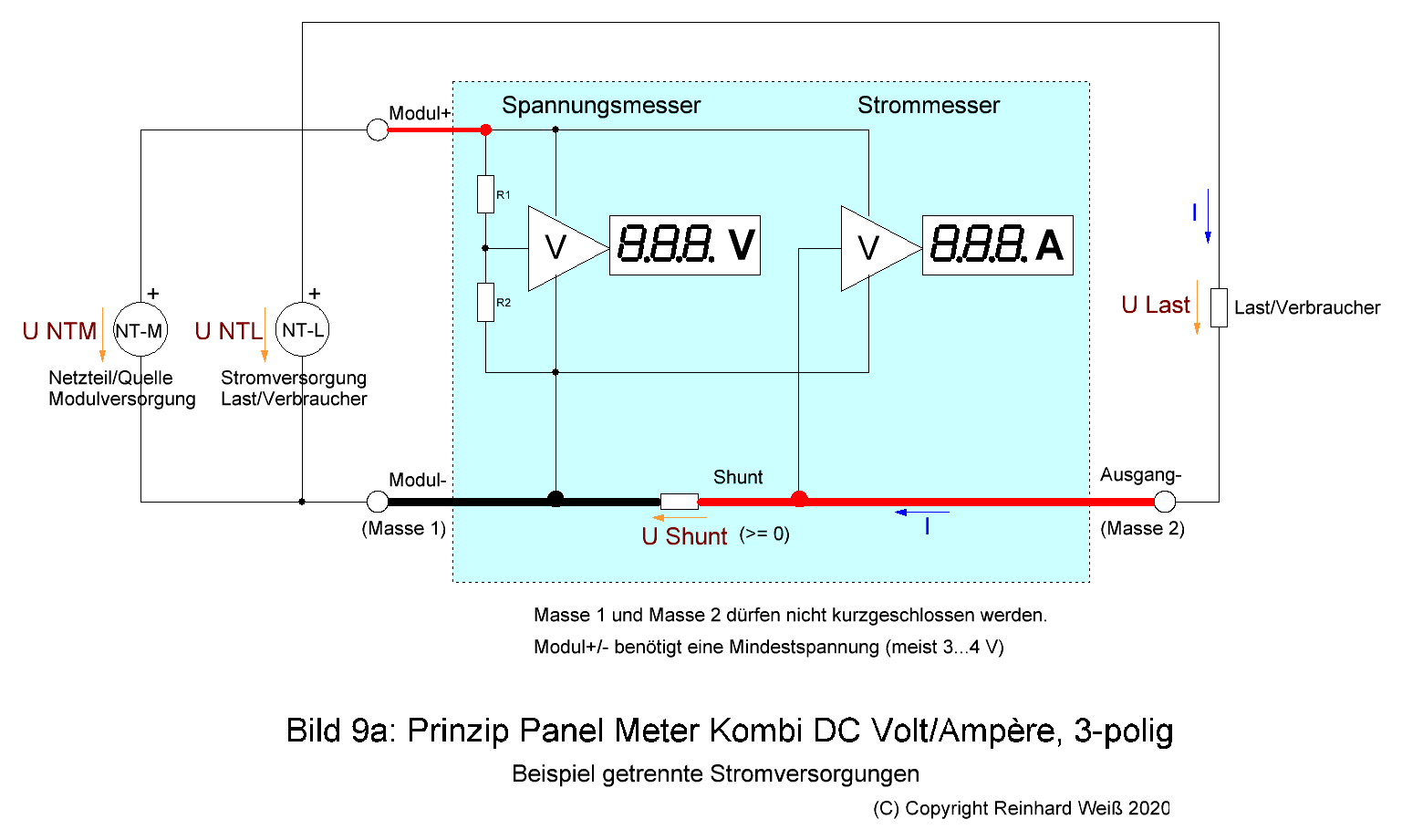 Aufwendigere Module können Spannung und Strom gleichzeitig anzeigen. Im einfachsten Fall reicht die 3-polige Beschaltung (Bild 9), mit wahlweise getrennten Stromversorgungen für Modul und Verbraucher (Bild 9a) oder gemeinsamer Stromversorgung (Bild 9b). Bei getrennter Stromversorgung lässt sich natürlich nicht die Spannung am Verbraucher messen. Daher ist die Variante nach Bild 9b meist sinnvoller, wenn obere und untere zulässige Spannungsgrenzen beachtet werden. Auch hier gilt wieder, dass keine gemeinsame Masse für Versorgung/Messspannung und Verbraucher vorliegt.